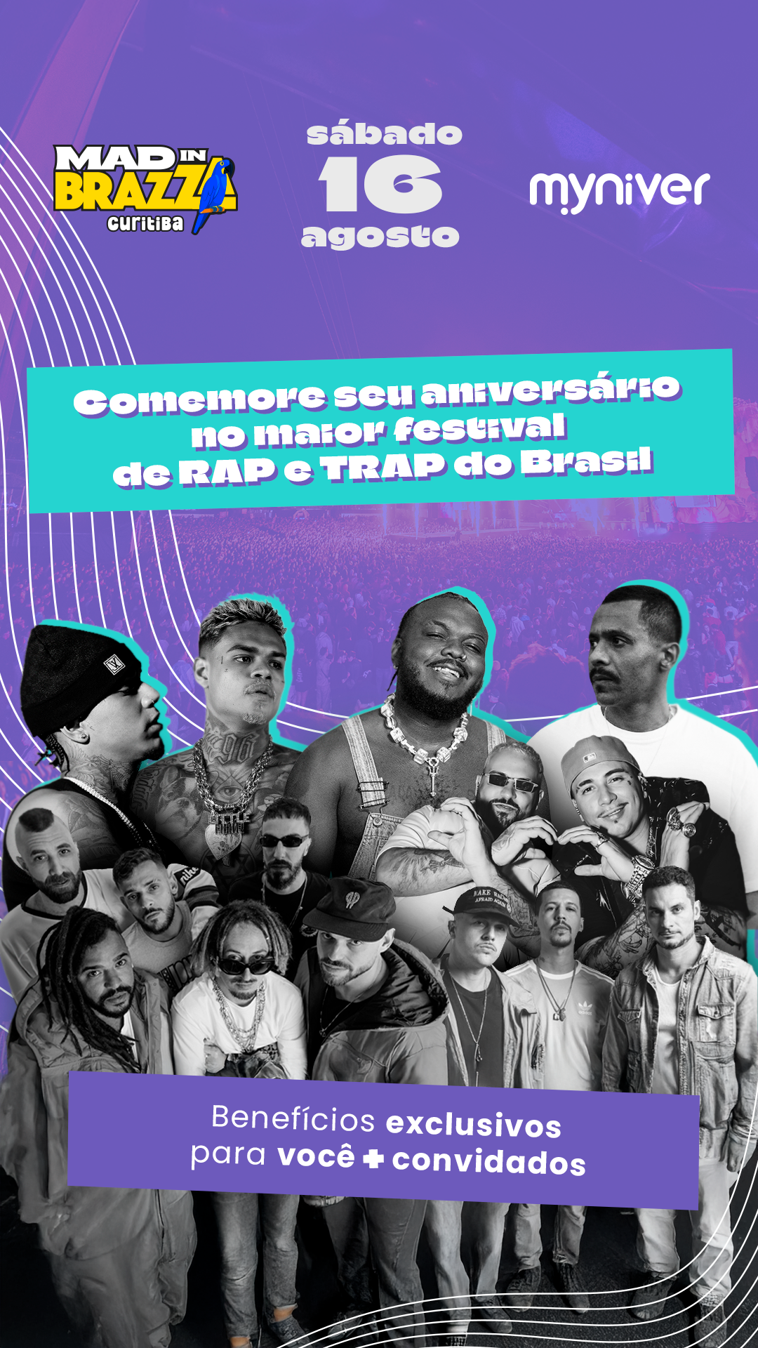 Aniversariante de Agosto, venha comemorar o seu aniversário no Mad in Brazza, que vai acontecer na Pedreira Paulo Leminski em Curitiba/PR, no endereço Rua João Gava, 970.